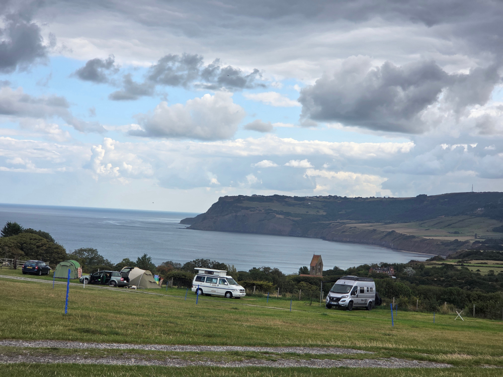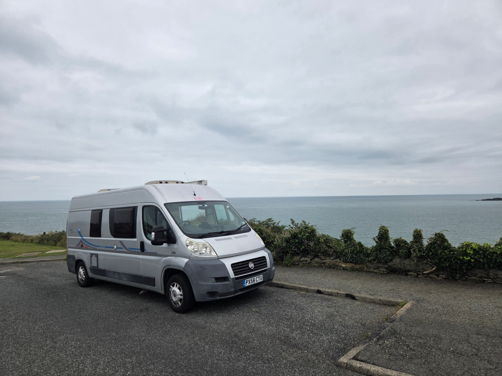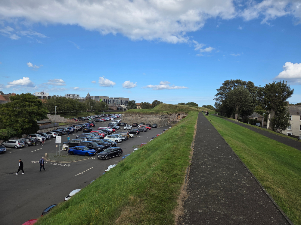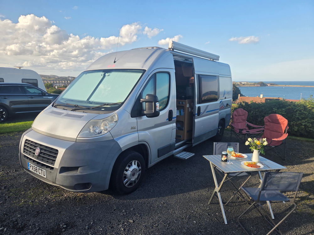 After shopping, fueling Kelda and getting two coffees for the road we left Edinburgh through town and down the A1. Arriving in Whitley Bay at twelve we parked in a carpark until 12:45. Driving to the caravan park we were the fourth in the queue to check in. We found a pitch near the sea and settled Kelda in, just in time for tea and cake.