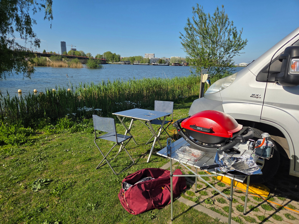 Steak cooked on the BBQ and caesar salad for dinner and then chilling out in the evening sunshine. When the temperature dropped we retired to Kelda and watched the sunset through the rear windows.