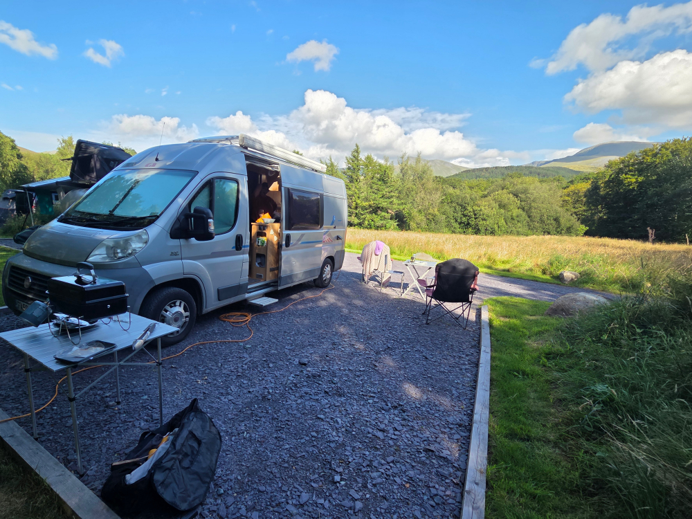 The road up past Loch Lomond to Glenco was more sheltered so no more water got in. We had plenty of time to look at the scenery as the other traffic decided that 45mph in a sixty limit was fast enough. With long queues of vehicles, overtaking was pointless. Arriving in Bunree we checked in and found a pitch right beside Loch Linnhe. The view is beautiful if a bit rainy at the moment.