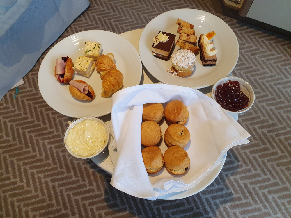 Shortly after our complimentary afternoon tea arrived. Sandwiches, cakes and scones with cream and jam.
