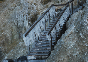 After an hour we arrived at our first stopping point a waterfall called Seljalandsfoss . The writeup in the guide book said there was a muddy path behind the falls. Having seen the stairs we decided not to attempt it.