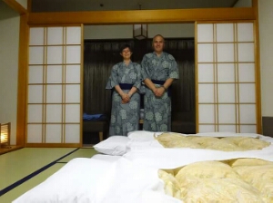 Checking in we have a traditional Japanese Room with a veiw of Mount Fuji. While we were out for dinner the maid remade the room for sleeping. This will be an interesting night.