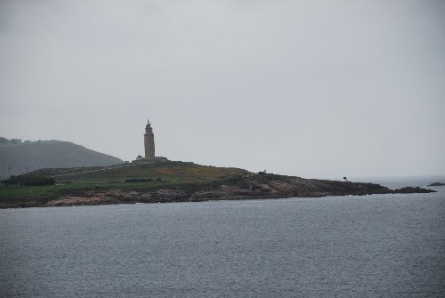 Approaching La Coruna, The Tower of Hercules in the morning mist. La Coruna, Spain