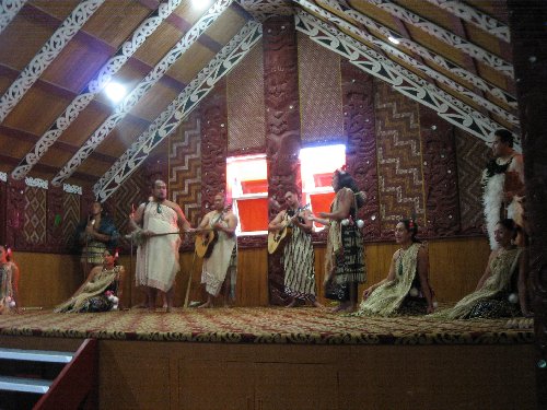 Inside a wharenui (Maori ceremonial hut)